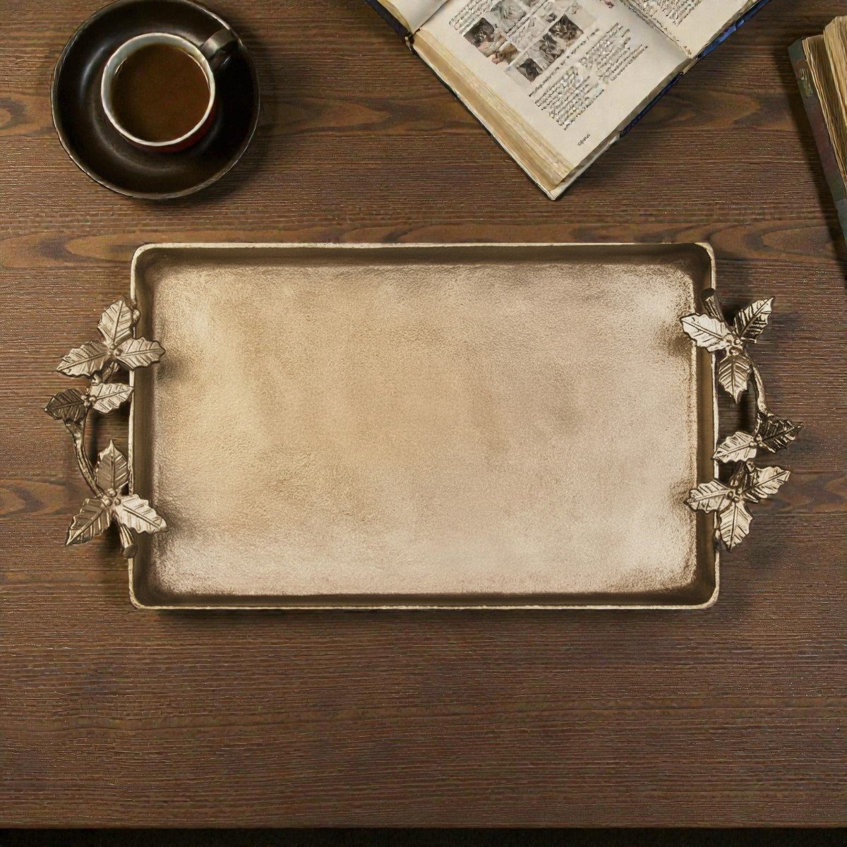 Elegant Gold Metal Serving Tray with Leaf Handles featuring a premium antique finish. Perfect for serving, table décor, festive use, and luxury home styling.