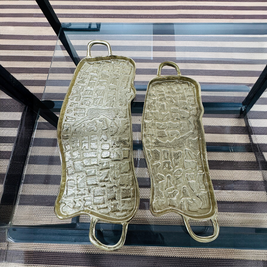 This serving tray set is crafted from high-quality metal and coated with a luxurious golden hammered finish. The textured surface gives a handcrafted and premium look.