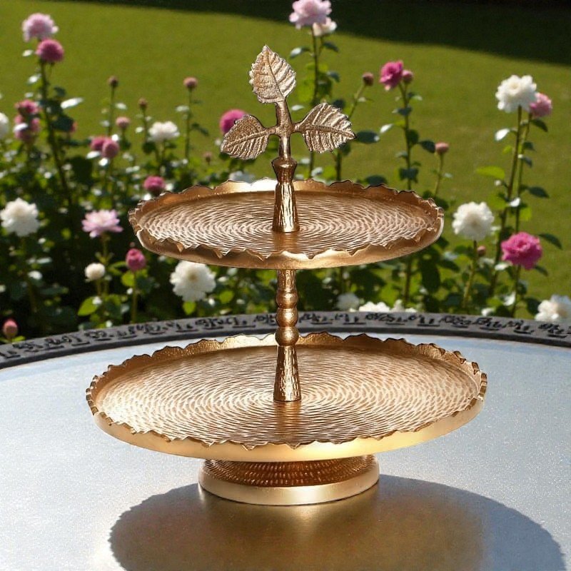Upgrade your dessert presentation with this beautifully crafted Luxury Two Tier Metal Cake Stand. Designed with a sleek structure and premium gold finish, this stand adds elegance and charm to any table setting.