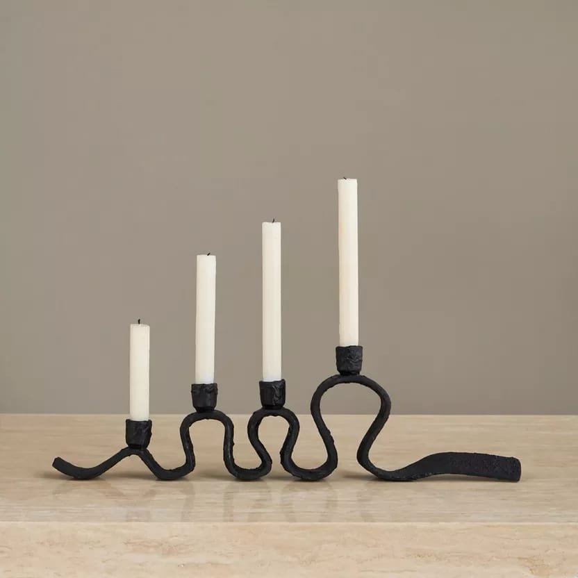 Add a touch of artistic elegance to your space with the Serpentine Iron Multi-Candle Stand. Crafted from sturdy iron with a sculptural wave design, this 4-holder candle stand beautifully blends modern minimalism with rustic charm.
